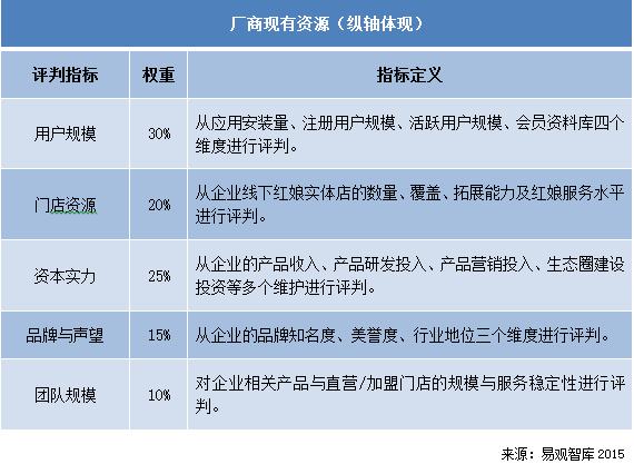Analysys易觀智庫分析認為,中國互聯網婚戀交友市場份額已基本集中在4大互聯網婚戀廠商上,當然也不乏一些創新廠商在移動端細分領域表現突出。不過互聯網婚戀交友業務發展到現階段,廠商現有資源的博弈已成為廠商之間競爭的重要資本。而用戶規模、門店資源、資本實力、品牌與聲望、團購規模正是評價廠商現有資源能力的重要指標。