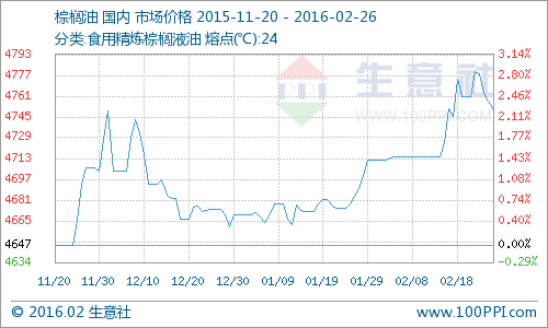 市場:多重利空,本周國內棕櫚油市場行情弱勢運行。首先,南馬棕果廠商公會的數據顯示,2月份的頭20天里,馬來西亞棕櫚油產量比1月份同期提高了2.6%。馬來西亞棕櫚油產量的意外增長,給國內棕櫚油價格帶來壓力。其次,南美大豆供應增加拖累豆油價格下滑,從而導致豆油搶占棕櫚油市場份額。再次,本周棕櫚油期貨市場行情弱勢運行,拖累棕櫚油現貨行情。利空因素疊加,國內棕櫚油價格連日下行。