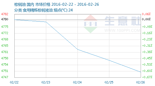 據(jù)監(jiān)測數(shù)據(jù)顯示,2月26日,國內(nèi)棕櫚油價格下跌。福建地區(qū)24度棕櫚油4900元/噸;天津地區(qū)24度棕櫚油4930元/噸;儀征地區(qū)24度棕櫚油5030元/噸;日照地區(qū)24度棕櫚油4950元/噸。