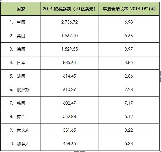 報(bào)告指出,中國已成為全球最大貿(mào)易國(表一)和最大出口國(表二),同時(shí)也是全球第二大進(jìn)口國(表三)。雖然中國經(jīng)貿(mào)持續(xù)增長(zhǎng)引發(fā)了國際社會(huì)的擔(dān)憂,但《晴雨表》顯示,未來五年中國的年增長(zhǎng)率預(yù)計(jì)為6.98%——而在上次報(bào)告中同期數(shù)字為5.60%,中國的主導(dǎo)地位將依舊堅(jiān)挺。MandhirSingh對(duì)此發(fā)表了中肯的看法:“中國在世界貿(mào)易當(dāng)中的領(lǐng)先地位在未來幾年都不會(huì)動(dòng)搖。但是市場(chǎng)對(duì)中國能否保持現(xiàn)在的增長(zhǎng)速度存有擔(dān)憂。而且中國的現(xiàn)有政策是從出口為導(dǎo)向的經(jīng)濟(jì)轉(zhuǎn)為擴(kuò)大內(nèi)需,不斷提升民眾的生活質(zhì)量,因此其影響力還有待觀察。”