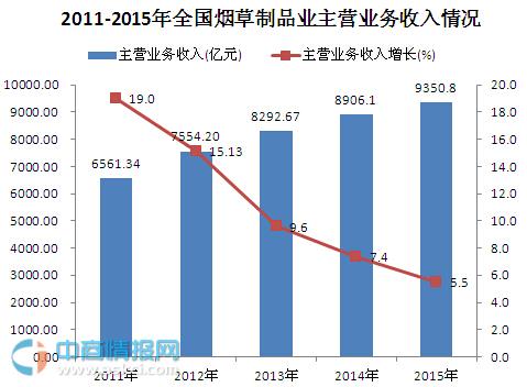 核心提示: 中國產業發展研究網訊:2015年中國煙草制品業主營業務收入9350.8億元,同比增長5.5%。由上圖可知,2011-2015年中國煙草制品業主營業務收入總額每年都呈上