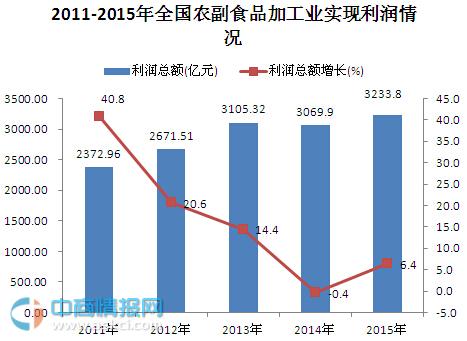 2015年全國農副食品加工業年利潤總額為3233.8億元,同比增長6.4%。由上圖可知,2011-2015年中國農副食品加工業利潤總額每年都呈上漲 的態勢,但農副食品加工業實現利潤總額的增長率卻逐步下陷。特別是2014年全國農副食品加工業利潤總額增長率跌至-0.4%,2015年中國非金屬礦采選業利潤總 額增長率微弱上漲至6.4%。