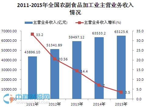 核心提示: 中國產業發展研究網訊:2015年中國農副食品加工業主營業務收入65125.6億元,同比增長3.5%。由上圖可知,2011-2015年中國農副食品加工業主營業務收入總
