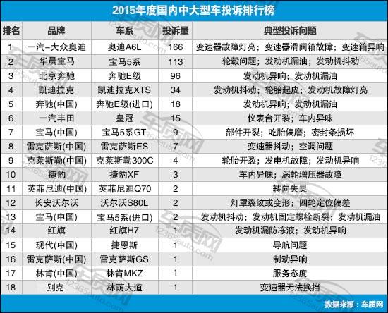 核心提示: 作為國內最大的缺陷汽車信息收集平臺,2015年,車質網上至少發生過一次車主投訴的中大型車有18款,這些車型的總投訴量為476宗,平均投訴量為26.4個,數據均作為國內最大的缺陷汽車信息收集平臺,2015年,車質網上至少發生過一次車主投訴的中大型車有18款,這些車型的總投訴量為476宗,平均投訴量為26.4個,數據均略高于去年。