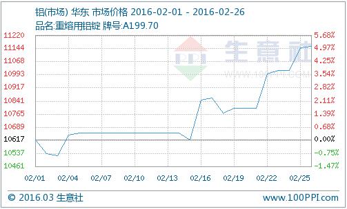 核心提示: 一.價格走勢圖據生意社數據顯示,2月國內鋁市一直呈緩緩上漲走勢。月初國內現貨鋁均價10617.5元/噸,月末為11157.5元/噸,漲5.09%。二、行情分析一.價格走勢圖