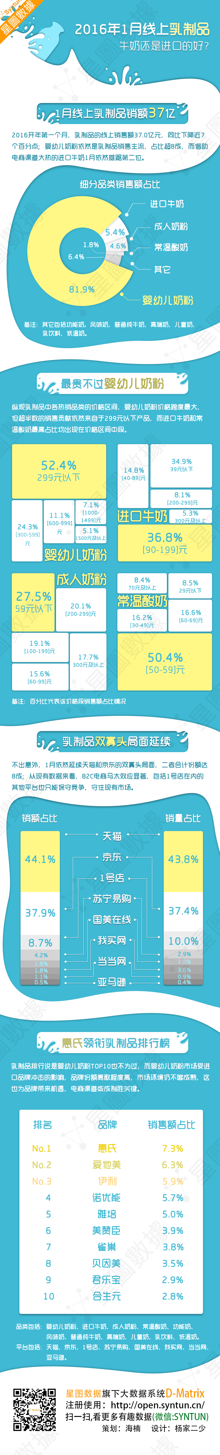 3月1日消息,星圖數據近日發布了2016年1月線上乳制品大數據。數據顯示,2016年1月線上乳制品銷售額達37億,同比下降近7個百分點,其中嬰幼兒奶粉占比超八成。