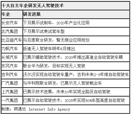 十大自主車企無人駕駛技術(shù)研發(fā)情況匯總一覽