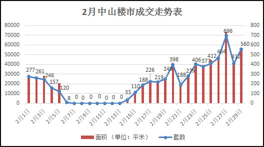 從走勢表上不難看出,春節期間連續6天0成交在整個表中明顯形成了一個凹陷,但進入2月下旬后,中山樓市以迅猛的勢頭重新回到較高的成交水平。