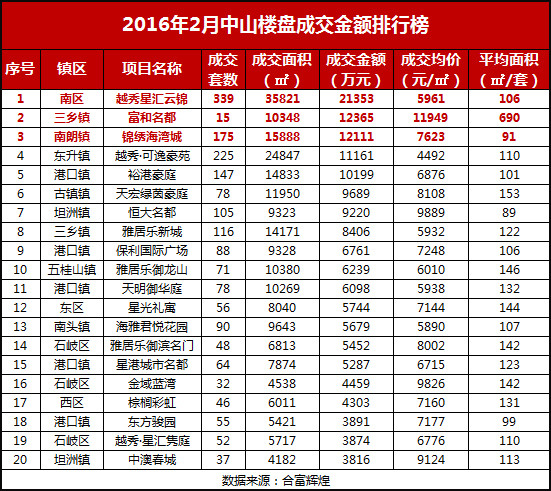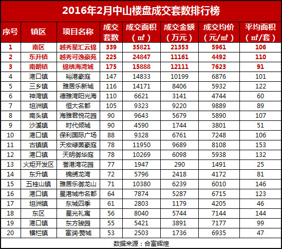 2016年2月中山房地產市場成交排行榜