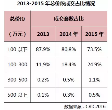 從總價段來看,2015年武漢市場成交主力是100萬以下的剛需產品,共成交15萬套,但占比正在逐年減退,2015年較2013年下降了14個百分點。相比之下,100-300萬元的中高端需求占比正逐步上升,因為房價快速上漲,武漢的商品住宅市場出現明顯的“中高端化”趨勢。