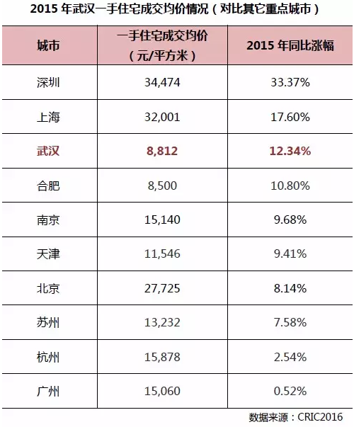 武漢2015年住宅成交2151萬平方米,成交金額為1895億元,較2014年分別增長32%和50%,無論面積、金額均達到最近5年峰值。成交均價8812元/平方米,較2014年上漲12.34%,漲幅是二線城市之最。