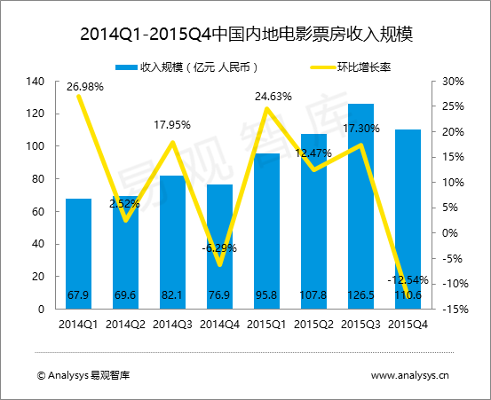 核心提示: 2015年第4季度,中國內地電影票房收入110.6億元人民幣,同比上漲43.82%,環比下滑12.54%。2015年全國電影票房總收入為440.69億元人民幣2015年第4季度,中國內地電影票房收入110.6億元人民幣,同比上漲43.82%,環比下滑12.54%。