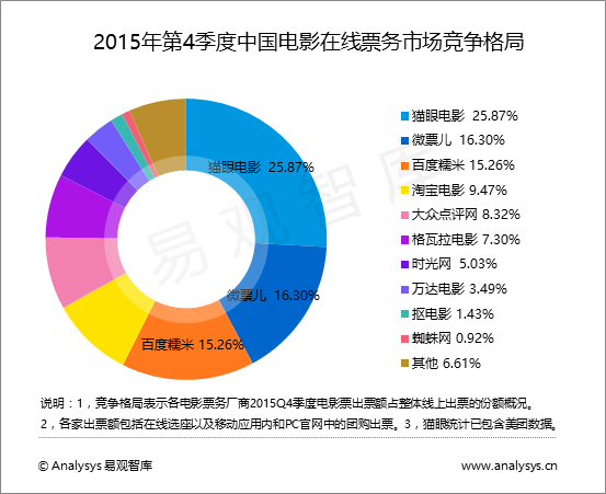 2015年第4季度,中國電影票務市場競爭格局中,貓眼電影、微票兒、百度糯米分別以25.87%、16.30%和15.26%占據中國電影在線票務市場前三位。貓眼電影和微票兒本季度的表現平穩,前者得益于前期份額優勢及美團導量,后者則主要借助微信及QQ重量級入口,自有產品微票兒將在2016年重點發展,一是使“微票兒”品牌度集中,二是為了構建完全自屬的電影、演出、體育等文化娛樂營銷與發行平臺。對比3季度,百度糯米4季度市場份額增長顯眼,15.26%的市場份額緊追微票兒,百度糯米通過與院線深度合作會員卡式,并持續進行會員票價補貼,是百度糯米市場份額連續突破的主要原因。格瓦拉電影本季度出票額排名第6,握有7.30%的市場份額。根據易觀千帆數據顯示,格瓦拉電影app產品的領域滲透率在下滑,2015年12月,淘寶電影的領域滲透率為7.33%,反超格瓦拉電影的4.37%。另外,在2015年上半年的票補大戰中,格瓦拉電影逐漸與領跑者們拉開差距,加上之后與微票兒合并,使得其“中高端城市文化休閑娛樂平臺”的定位更加明確,專心主打一二線城市的中產階級用戶。至此,貓眼電影與大眾點評網的共占據34.19%市場份額,微票兒與格瓦拉電影一共占據23.60%,“新美大”與“新微格”共占據中國電影在線票務市場近6成份額。