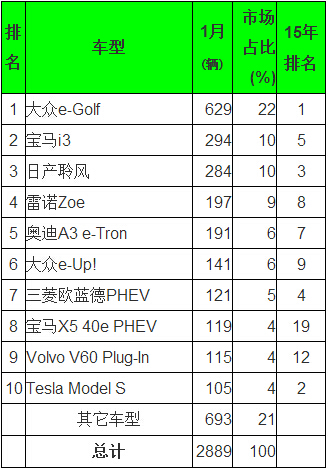 大眾e-Golf連續第11個月保持最暢銷電動汽車稱號,當月賣出629輛。寶馬i3以294輛的成績排名第二,日產聆風取得第三,相比去年1月的309輛,銷量令人小失望,只有284輛。