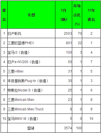 2016年1月日本電動汽車分車型銷量排名情況