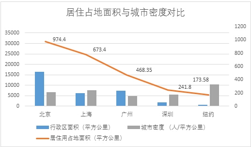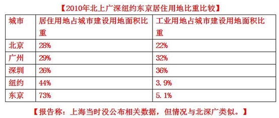1、2010年,北京、廣州和深圳的居住用地占城市建設(shè)用地面積的比重明顯低于紐約、東京;而工業(yè)用地占比則大幅高于紐約、東京。上海沒(méi)有公布相關(guān)數(shù)據(jù),但情況與北深廣應(yīng)該類似