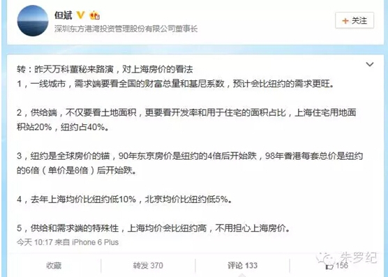 圖1:網(wǎng)傳的萬(wàn)科董秘對(duì)上海房?jī)r(jià)的看法