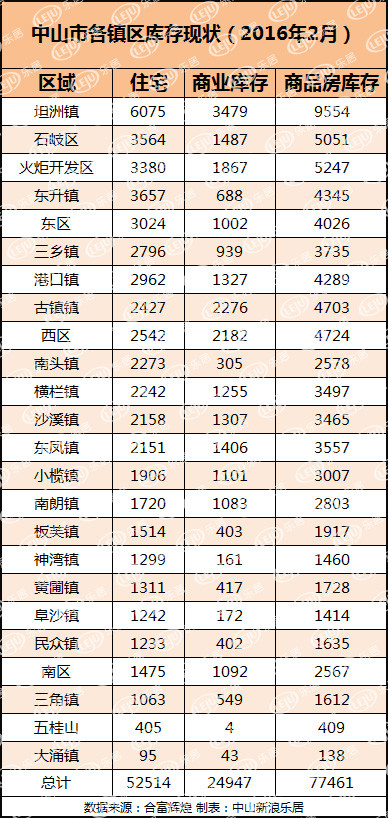 截止到2016年2月,坦洲鎮商業庫存3439套排名第一,沙溪鎮3193套居第二,古鎮鎮2274套排名第三。