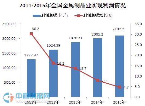 2015年全國金屬制品業(yè)全年利潤總額為2102.2億元,同比增長4.7%。2011-2015年,金屬制品業(yè)實現(xiàn)的利潤總額一直延續(xù)上漲的態(tài)勢,但金屬制品業(yè)利潤增長率逐年下滑,利潤增長率由2011年的30.2%下滑至2015年的4.7%。