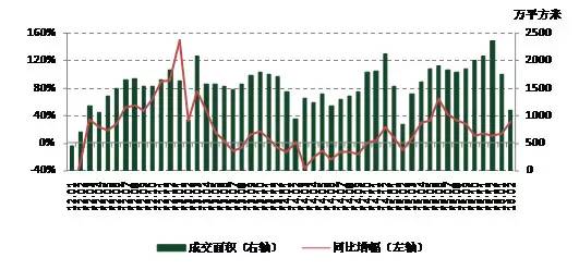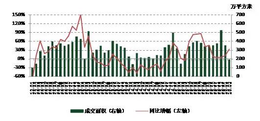 圖1 30個典型城市新建商品住宅成交面積及同比增幅