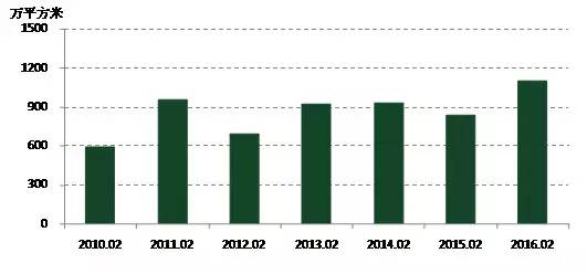 對照近7年2月份的成交數據,可以看出,相比2010年至2015年6年間的同期水平,2016年2月份30個城市新建商品住宅成交面積分別增長了86.6%、14.6%、58.6%、18.9%、17.8%和31.4%。如此對比,今年2月份市場成交是近7年同期最好的水平。