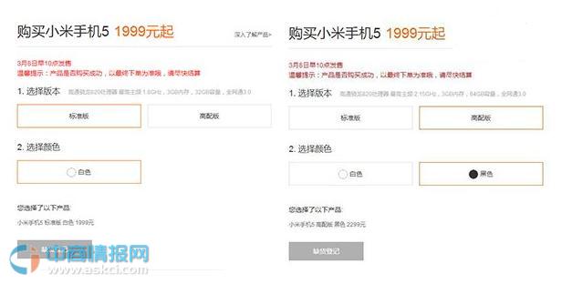現(xiàn)在,好消息來了,小米官網(wǎng)將在明天上午10點(diǎn)開啟小米5的第二輪搶購。小編注意到,從相關(guān)頁面給出的選項(xiàng)來看,明天官網(wǎng)將提供小米5高配版的黑色版本,而且僅有高配版有黑色版選項(xiàng),售價(jià)是2299元。也就是說,如果你對小米5情有獨(dú)鐘但又忍受不了白色版的黑邊,那么明天放出的高配黑色版將是一個(gè)不錯(cuò)的選擇。