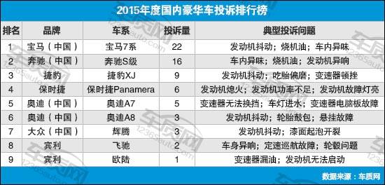 核心提示: 作為國內最大的缺陷汽車產品信息收集平臺,車質網的統計顯示,2015年至少發生過一次車主投訴的豪華車有9款,總投訴量為67宗,平均投訴量為7.4宗。數據看點:德作為國內最大的缺陷汽車產品信息收集平臺,車質網的統計顯示,2015年至少發生過一次車主投訴的豪華車有9款,總投訴量為67宗,平均投訴量為7.4宗。