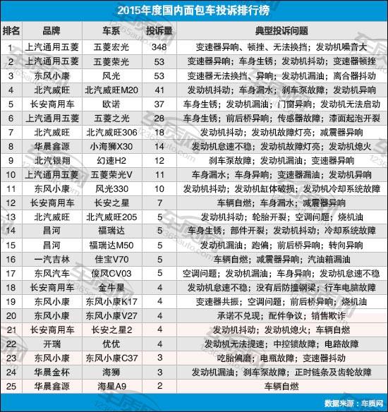 核心提示: 作為國(guó)內(nèi)最大的缺陷汽車產(chǎn)品信息收集平臺(tái),車質(zhì)網(wǎng)的統(tǒng)計(jì)顯示,2015年至少發(fā)生過(guò)一次車主投訴的面包車有49款,總投訴量為717例,平均投訴量為14.6例。全年度作為國(guó)內(nèi)最大的缺陷汽車產(chǎn)品信息收集平臺(tái),車質(zhì)網(wǎng)的統(tǒng)計(jì)顯示,2015年至少發(fā)生過(guò)一次車主投訴的面包車有49款,總投訴量為717例,平均投訴量為14.6例。全年度乘用車銷量冠軍五菱宏光以幾近投訴總量一半的最高數(shù)值拉高了面包車的整體投訴數(shù)量,一些市場(chǎng)在售的面包車因?yàn)殇N量較少、車主心里預(yù)期等原因并沒(méi)有出現(xiàn)投訴反饋,但這并不能表明它們一定擁有很好的可靠性表現(xiàn)。