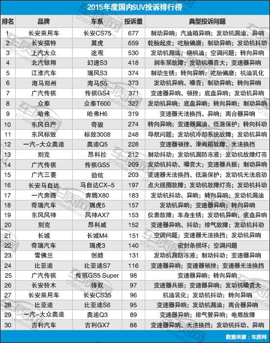 與2014年相比SUV熱門(mén)投訴車(chē)型變化較大