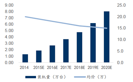 根據調研數據,2014年我國AGV的裝機量為1.3萬臺,其中約1萬臺為國產品牌,3000臺為外資品牌,從價值量來說,國內廠商占比大約60%,國外廠商占比40%。按照每年30%~50%的增長率估算,到2020年我國的AGV裝機量將達到8萬臺。