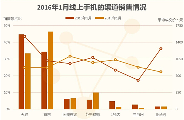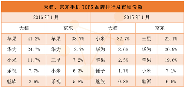 2016年1月,天貓上蘋果手機銷售占比高達41.2%,華為、樂視和魅族也都漲幅明顯,而小米則由去年的82.7%大幅下滑至11.7%;此外,天貓上蘋果、華為、小米、樂視的銷售占比也都大幅超過京東,在高端手機和低價千元機的銷售上成就了雙贏。