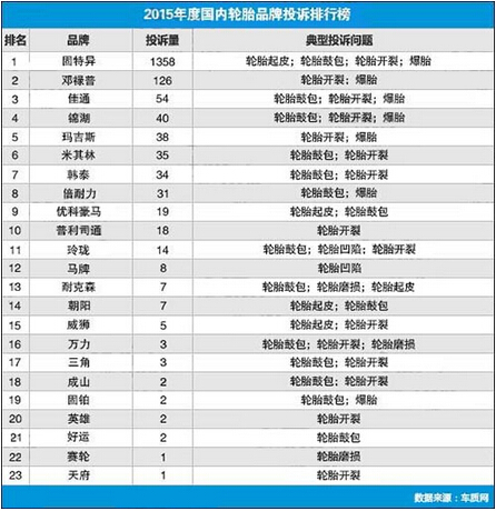 2015年度國內輪胎投訴排行榜:外資品牌投訴量大