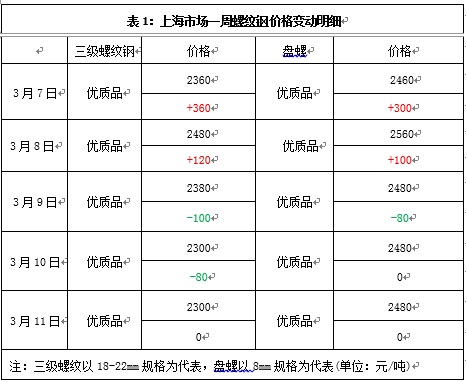 核心提示: ●供需分析:鋼廠復產逐步增多,鋼材出口大幅回落;●宏觀分析:兩會政策利好市場,央行資金大幅回籠;●綜合觀點:本周國內鋼價暴漲暴跌,市場已經脫離基本面的預期,金●市場回顧:資金助推情緒不穩,鋼價一周振幅巨大;