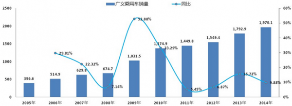 2005-2014年我國廣義乘用車銷量及增速(單位:萬輛)
