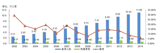 自 1988 年我國大陸首條高速公路滬嘉高速公路建成通車以來,經過 20 多年的持續快速發展,我國高速公路通車總里程實現了歷史性跨越,截至 2013 年末,我國高速公路總里程達到 10.44 萬公里,僅次于美國位居世界第二位,近十年來年均增長率在 10%以上,當前的絕對增量依然強勁。