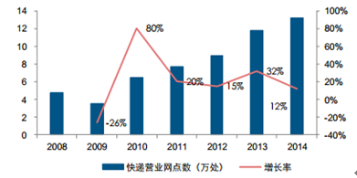 2009-2014年快遞營業網點增加加劇行業人力、物力成本負擔