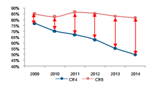 2009-2014年中國快遞行業市場業務量集中度