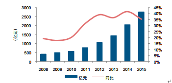 2008-2015年中國快遞行業業務收入和增速
