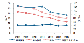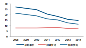 2008-2014年行業競爭疊加規模效應致快遞單價下行
