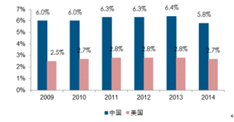 2009-2014年我國物流倉儲成本高于美國