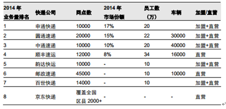http://www.chyxx.com/research/201603/390916.html在 B2C 電商爆發的 2009 年,以三通一達和順豐為代表的民營快遞企業突然發力,快遞市場占有率(按業務量)開始超越國有快遞企業,2014 年,民營快遞企業的市場份額達到了 86%,遠超國有企業的 13%。