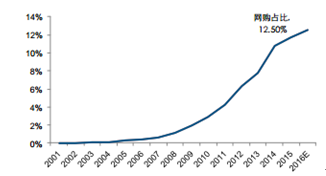 2001-2016年線上交易占比迅速提升