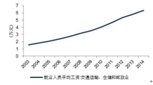 2003-2014年倉儲業就業人員平均工資持續攀升