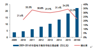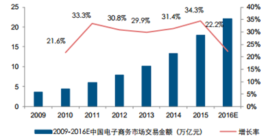 2009-2016年中國電子商務市場交易規模趨向平穩增長