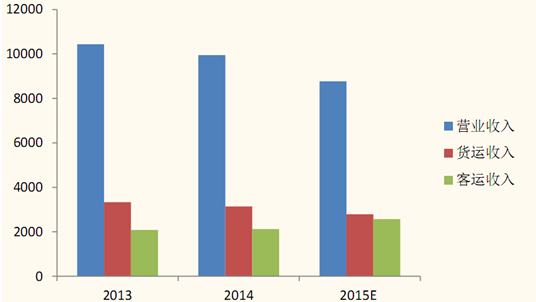 2015 年前三季度,中國鐵路總公司實現營業收入 6578 億元,其中貨運收入2093 億元,客運收入 1930 億元。營業收入總額同比下降 10.26%,下降主要原因來源與貨運收入的下降,降幅 11%,客運收入同比增加 21%。這已經是中國鐵路總公司自2013年來連續第三年營業收入下降。