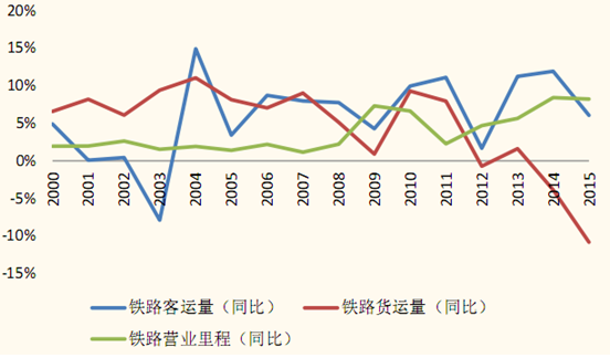 1、從鐵路貨運量來看,15 年全國鐵路貨運量為 33.6 億噸,同比下降 11.9%,相當于 2009年貨運量水平。鐵路貨運量自 2013年達到 39.67億噸后,年貨運量就呈現下降趨勢。綜合近 20 年鐵路貨運量波動來看,鐵路貨運量兩增速與全國 GDP 增速保持相同趨勢。2015 年全國 GDP 增速再次下降,達到 6.9%。受累于全國宏觀經濟疲軟,鐵路貨運量也出現大幅下降。