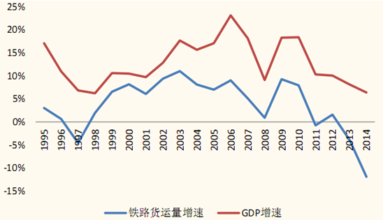 1995-2014年鐵路貨運量及GDP增速