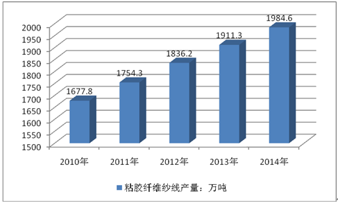 2014全球膠粘纖維紗線產量為1984.6萬噸,消費量為1844.7萬噸