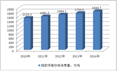 2010-2014年全球粘膠纖維紗線消費量:萬噸