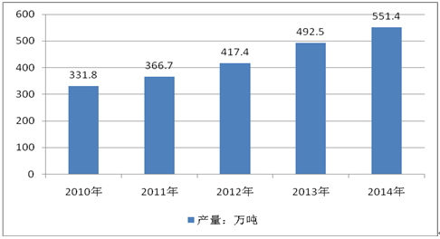 2010-2014年全球粘膠纖維產(chǎn)量:萬(wàn)噸